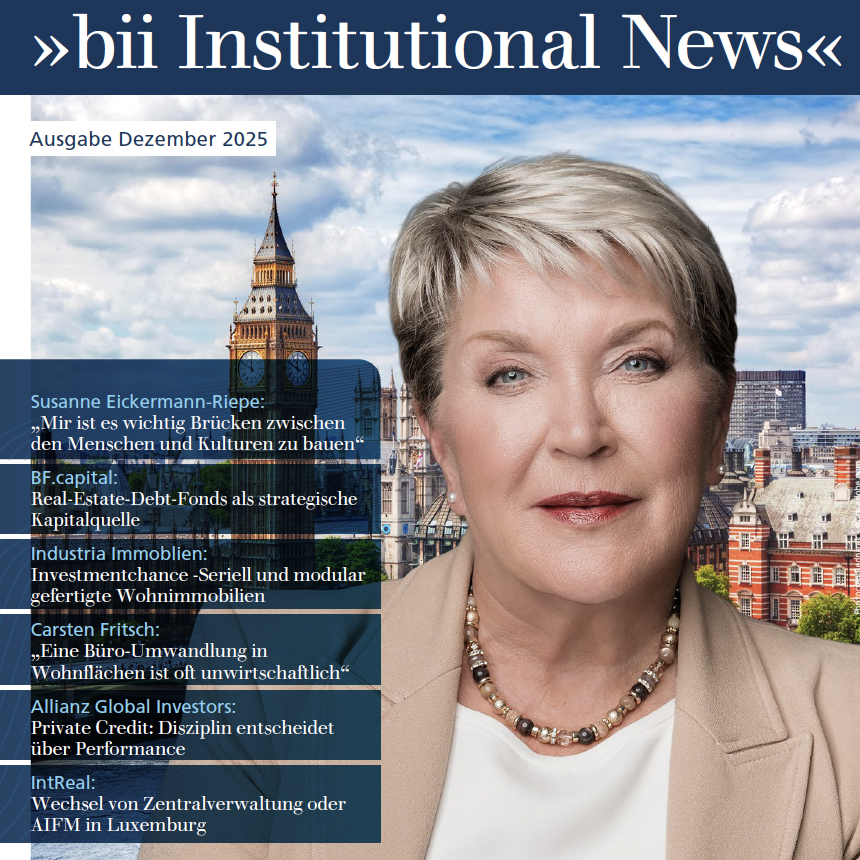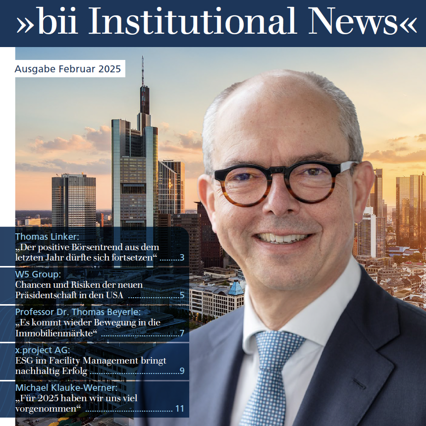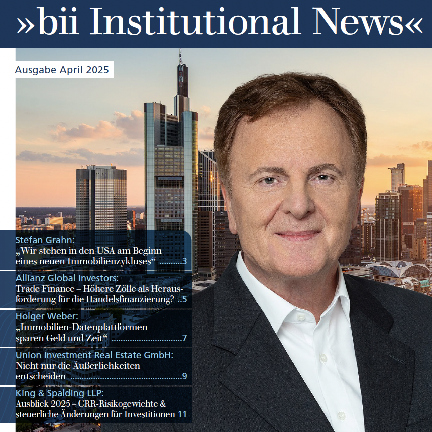 Die bii Institutional News ist der Kommunikationskanal für institutionelle Investoren in Deutschland. Digital, als HTML-Newsletter, über den Social-Media-Kanal des bii und als Druckausgabe zum Tag der Institutionellen Kapitalanlage informieren die Ausgaben 10 Mal im Jahr über 3.000 relevante Entscheider bundesweit. Neben Interviews mit institutionellen Investoren kommt auch die Wissenschaft zu Wort, und Partner erhalten die Gelegenheit mit Gastbeiträgen von ihrer Expertise zu überzeugen.